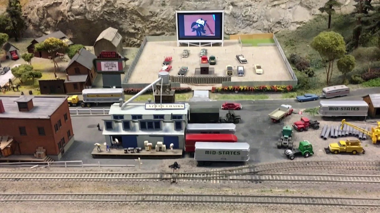 Now we arrive in Sandy Oregon. There is a drive in theater with old movies (I, myself am related to some movie stars: The Three Stooges). We also have a furniture shop serviced by a rail siding just off the mainline.