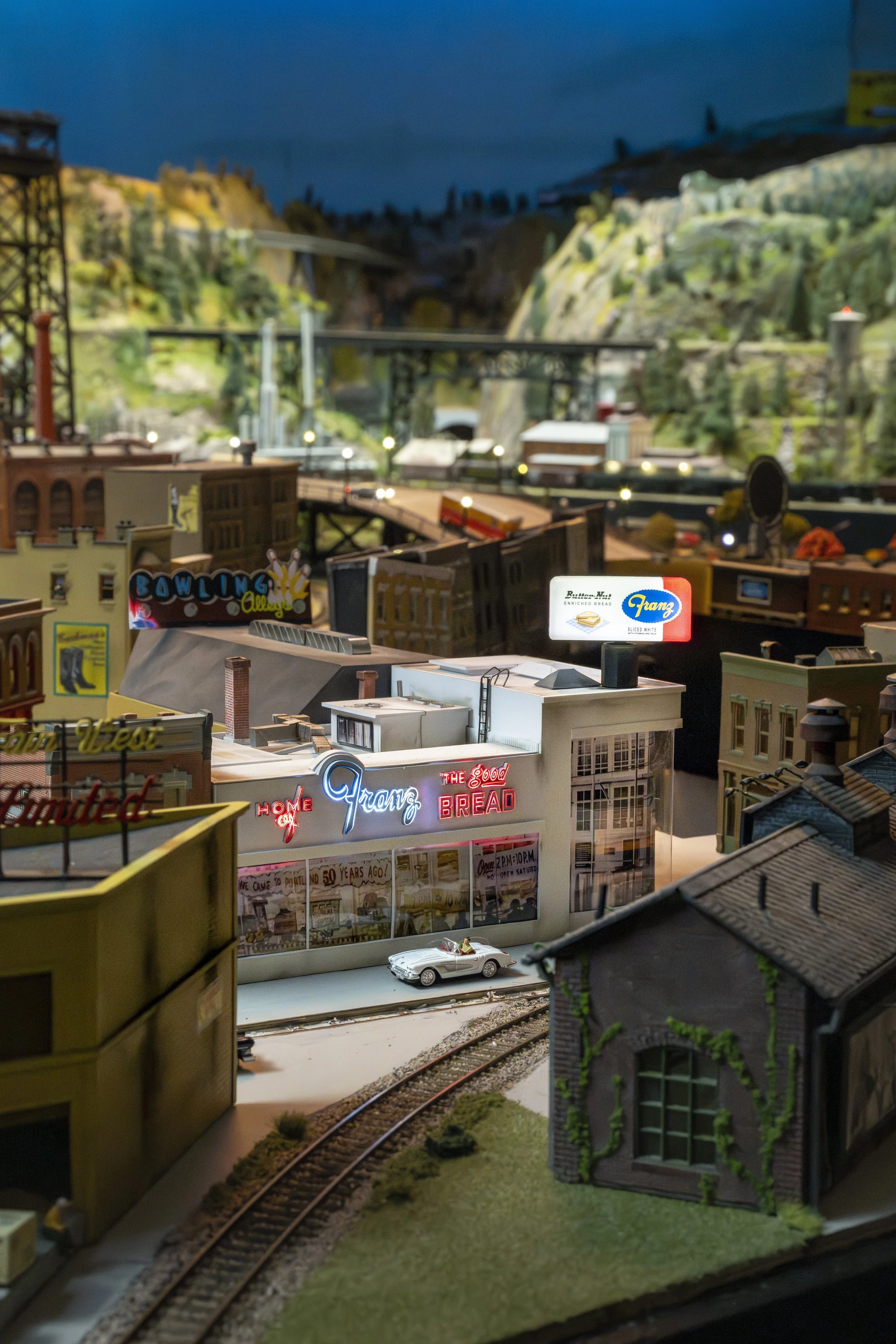 Alongside the train station we have a bus station, and next door is a fire station, and many other buildings, including a new feature of our Downtown Portland. We now have Franz Bakery complete with the Famous spinning Bread Sign. Soon we will also have a 7-Up building and 7-Up sign! Continuing onward, we have Oaks Park, and the Steel Bridge.
